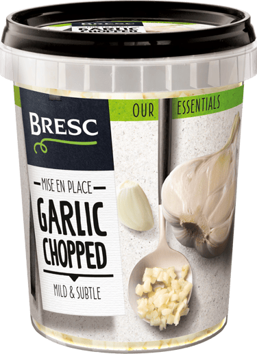 Coarsely chopped garlic made from fresh bulbs that are processed immediately after harvesting. Preserved with very little salt and citric acid in good-quality sunflower oil. Young garlic has a mild flavour and a subtle, delicate aroma. Suitable for a range of uses in the kitchen; its mild taste makes it extremely suitable for dressings. Consistent quality and available all year round.